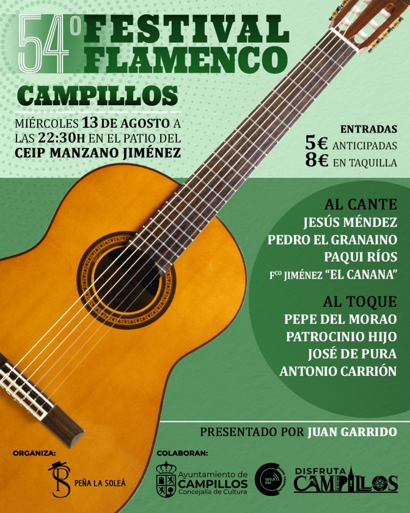 La programación continuará a las 22:30 horas en el CEIP Manzano Jiménez con el LIV Festival de Cante Flamenco, organizado por la Peña Flamenca “La Soleá” y la Concejalía de Cultura. El cartel estará compuesto por las voces de Jesús Méndez, Pedro ‘El Granaíno’, Paqui Ríos y Francisco ‘El Canana’, acompañados al toque por Pepe del Morao, Patrocinio Hijo, José de Pura y Antonio Carrión. La presentación correrá a cargo del periodista y crítico flamenco Juan Garrido.