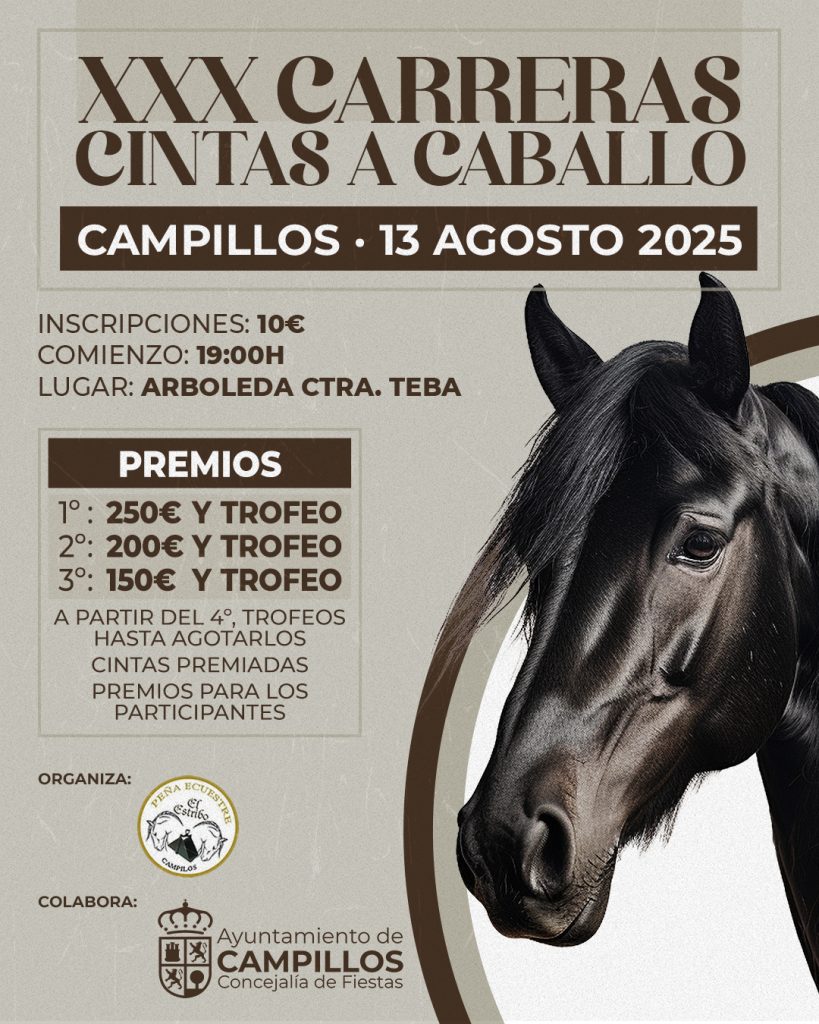 Campillos se prepara para vivir una de sus citas más esperadas del año. La Feria de Agosto 2025 se celebrará del jueves 14 al domingo 17 de agosto, pero el miércoles 13 arrancará la fiesta con una jornada de víspera cargada de tradición y espectáculo. Desde las 19:00 horas, la arboleda junto a la carretera de Teba acogerá las XXX Carreras de Cintas a Caballo, organizadas por la Peña Ecuestre “El Estribo” en colaboración con la Concejalía de Fiestas. La prueba, símbolo del inicio de la feria, reunirá a jinetes y público para competir por premios en metálico, trofeos y obsequios.