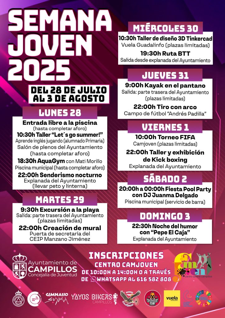 La Concejalía de Juventud y el Centro Juvenil Camjoven ya tienen todo preparado para la Semana Joven 2025, que se celebrará del 28 de julio al 3 de agosto. El Ayuntamiento de Campillos ha diseñado una programación variada, gratuita y pensada para la participación activa de la juventud local.