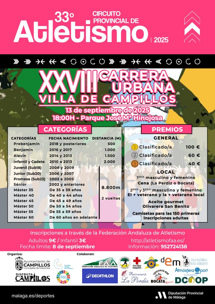 Campillos acogerá el próximo 13 de septiembre la XXVIII Carrera Urbana Villa de Campillos, una cita consolidada en el calendario deportivo de la localidad y que forma parte del XXXIII Circuito Provincial de Carreras Populares promovido por la Diputación de Málaga.