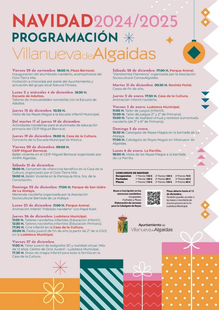El Ayuntamiento de Villanueva de Algaidas ha publicado la programación de Navidad 2024/2025, un calendario repleto de actividades culturales, educativas y festivas que invita a vecinos y visitantes a disfrutar de unas fiestas llenas de tradición y momentos inolvidables