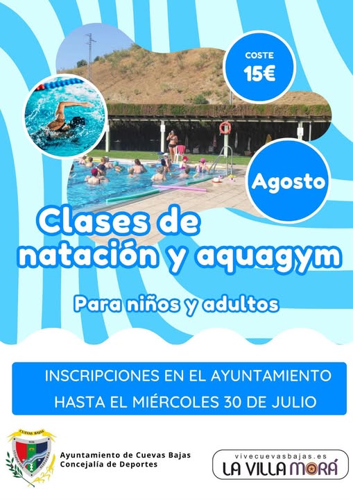 El Ayuntamiento de Cuevas Bajas ha abierto el plazo de inscripción para las clases de natación y aquagym que se celebrarán durante el mes de agosto. La actividad, organizada por la Concejalía de Deportes, está dirigida tanto a niños como a adultos y tiene un coste simbólico de solo 15 euros