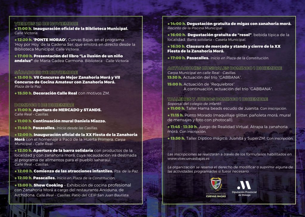 El municipio de Cuevas Bajas clausura hoy domingo 1 de diciembre la XX Fiesta de la Zanahoria Morá, declarada de Interés Turístico por la Diputación Provincial de Málaga, el evento que combina gastronomía, actividades culturales y solidaridad, consolidándose como una de las citas más importantes de la comarca.