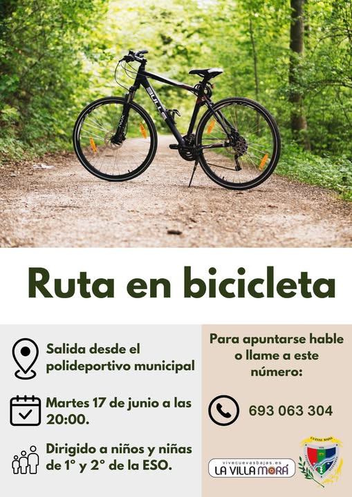 El Ayuntamiento de Cuevas Bajas organiza esta tarde, martes 17 de junio, una ruta en bicicleta dirigida a niños y niñas de 1.º y 2.º de la ESO. La salida será a las 20:00 h desde el polideportivo municipal.