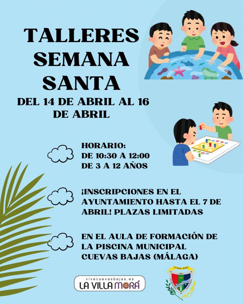 El Ayuntamiento de Cuevas Bajas ha puesto en marcha una nueva edición de los talleres infantiles de Semana Santa, dirigidos a niños de 3 a 12 años. Las actividades se llevarán a cabo del 14 al 16 de abril en el Aula de Formación de la Piscina Municipal, en horario de 10:30 a 12:00 horas. Las inscripciones estarán abiertas hasta el 7 de abril y las plazas son limitadas.