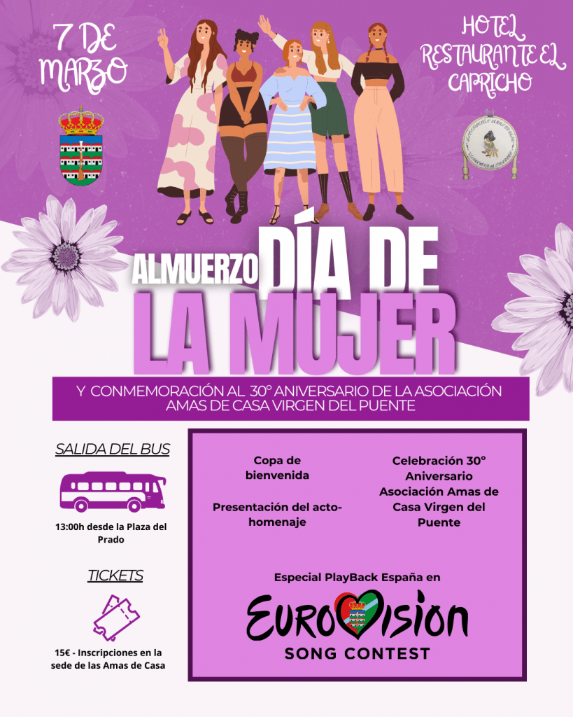 Las actividades darán inicio el viernes 7 de marzo a las 12:00 horas con la lectura de un manifiesto en la puerta del Ayuntamiento, un momento de reflexión y compromiso en favor de los derechos de las mujeres. Acto seguido, se celebrará el tradicional almuerzo-homenaje del Día de la Mujer, organizado en colaboración con la Asociación Amas de Casa «Virgen del Puente», que este año recibe un reconocimiento especial por su 30.º aniversario. Además, se homenajeará a una mujer del municipio cuya labor y entrega han sido fundamentales en la comunidad.