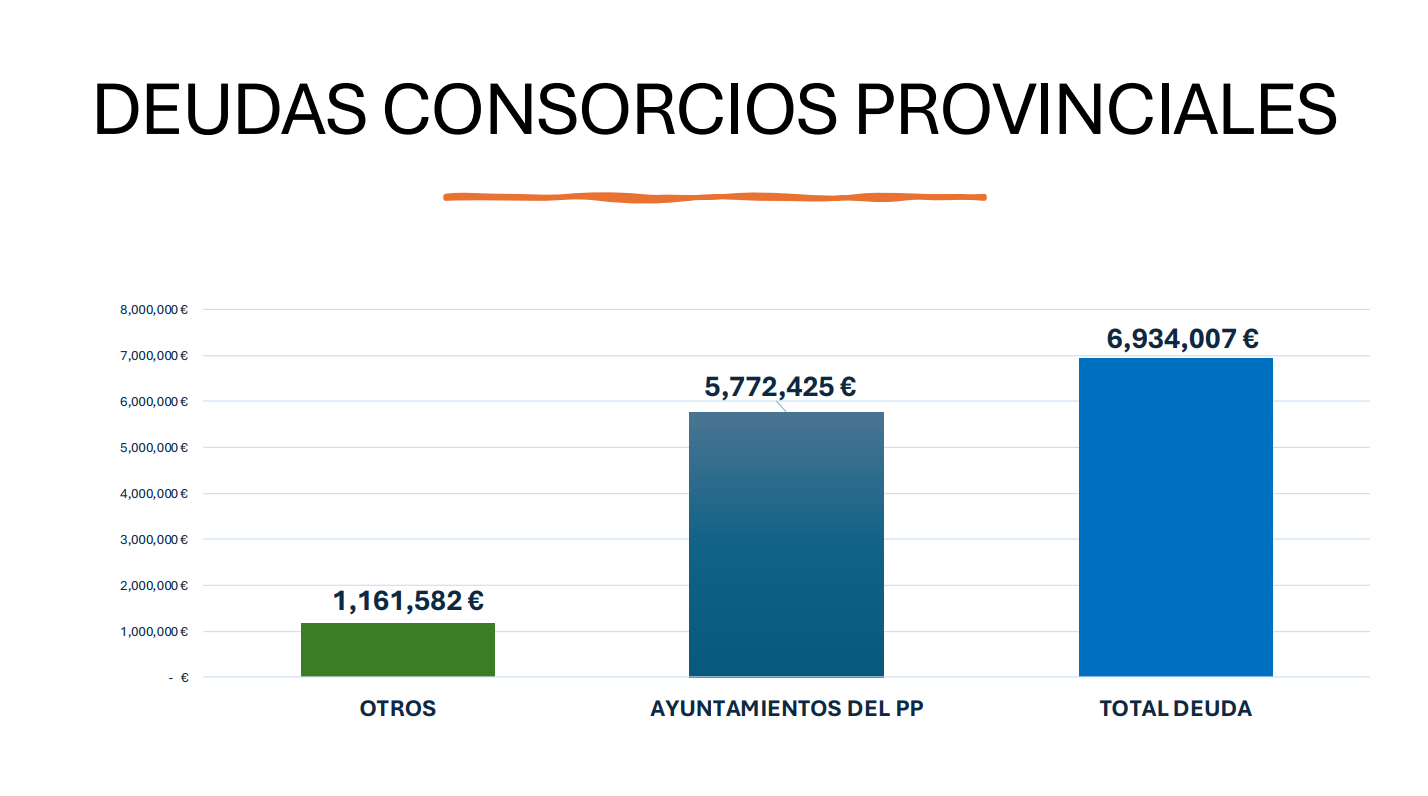 Según el informe elaborado a partir de la documentación oficial remitida por el equipo de gobierno provincial (actualizado a febrero de 2026), la deuda total de los ayuntamientos con los consorcios dependientes de la Diputación asciende a 6.934.000 euros, casi siete millones de euros.