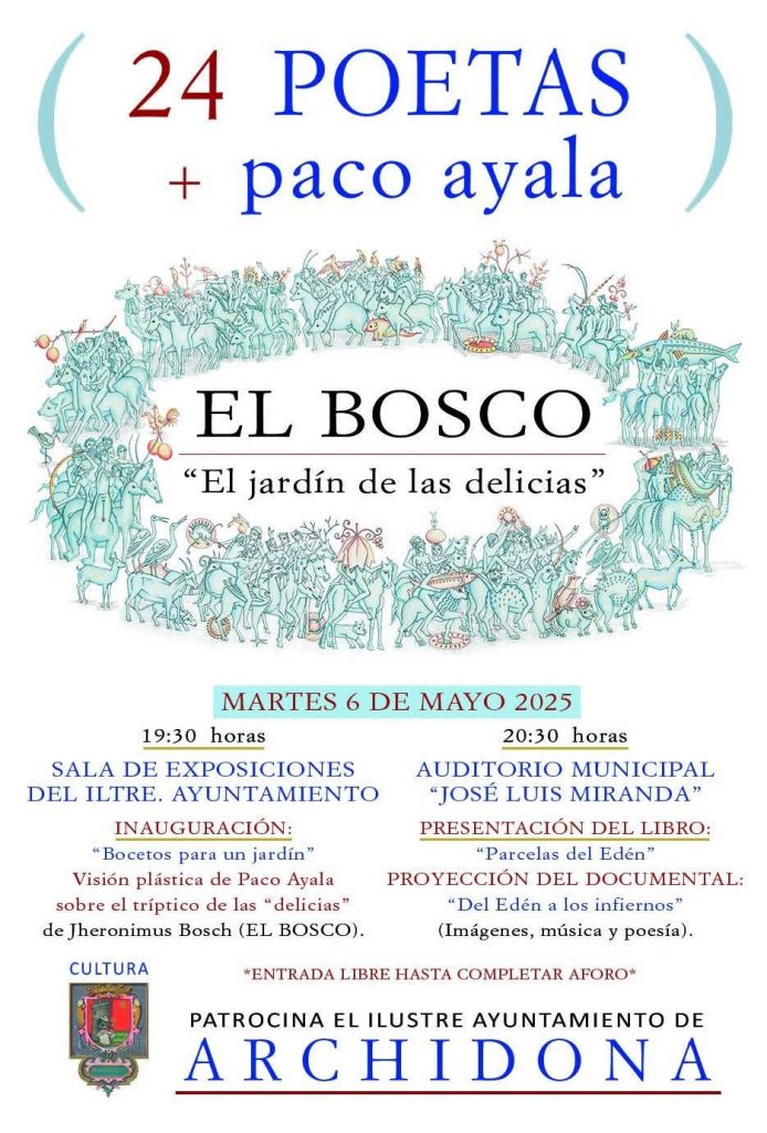 La Delegación de Cultura del Ilustre Ayuntamiento de Archidona y el artista Paco Ayala proponen un viaje sensorial y artístico al mundo del Bosco este martes 6 de mayo, con una exposición, un libro coral de poesía y un documental inspirados en «El jardín de las delicias».