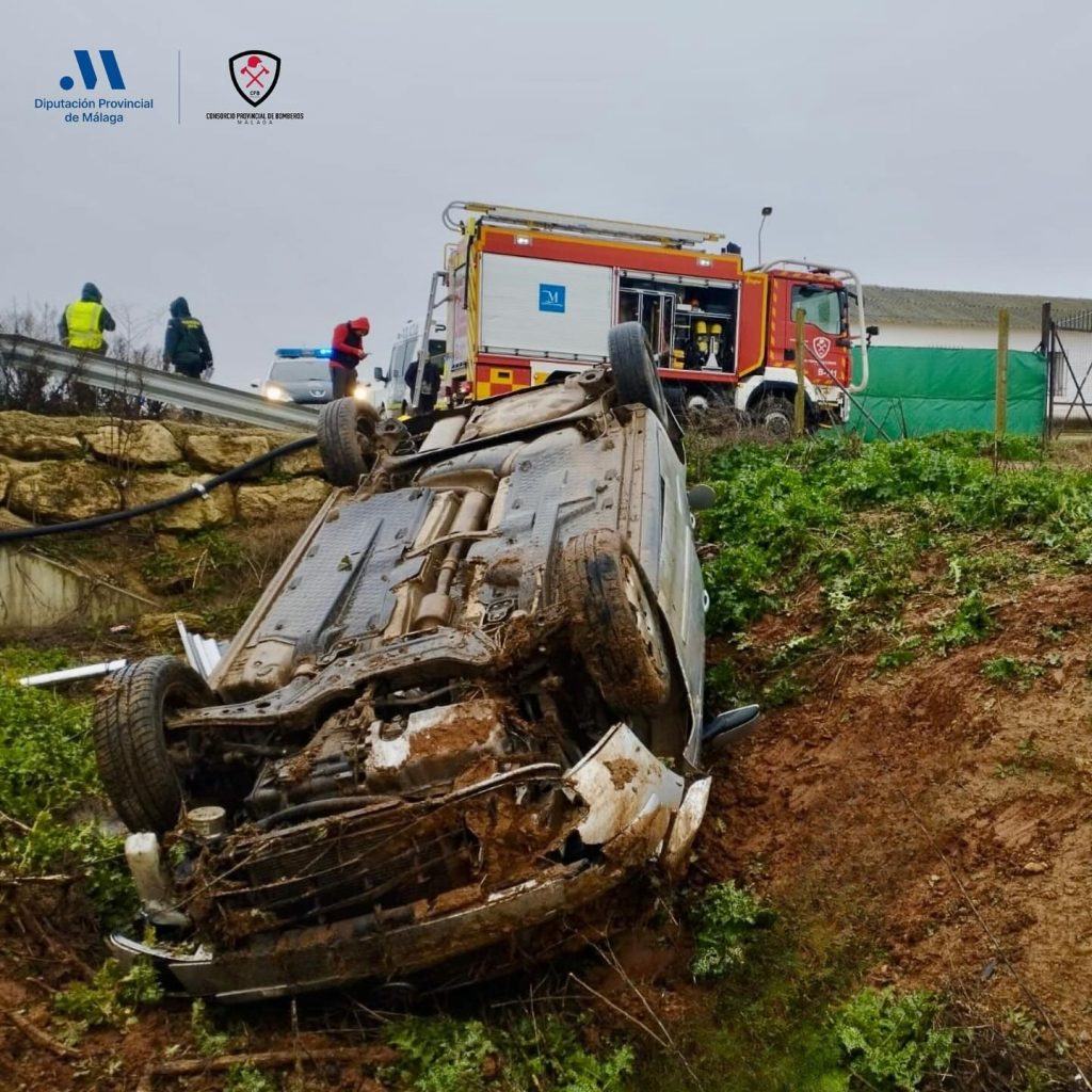Durante la tarde de ayer, efectivos del Consorcio Provincial de Bomberos de Málaga actuaron en un accidente de tráfico ocurrido en el kilómetro 12 de la carretera A-365, en Campillos. El siniestro involucró a un único vehículo, que tras salirse de la vía terminó completamente boca abajo, dejando atrapado a su conductor y único ocupante.
