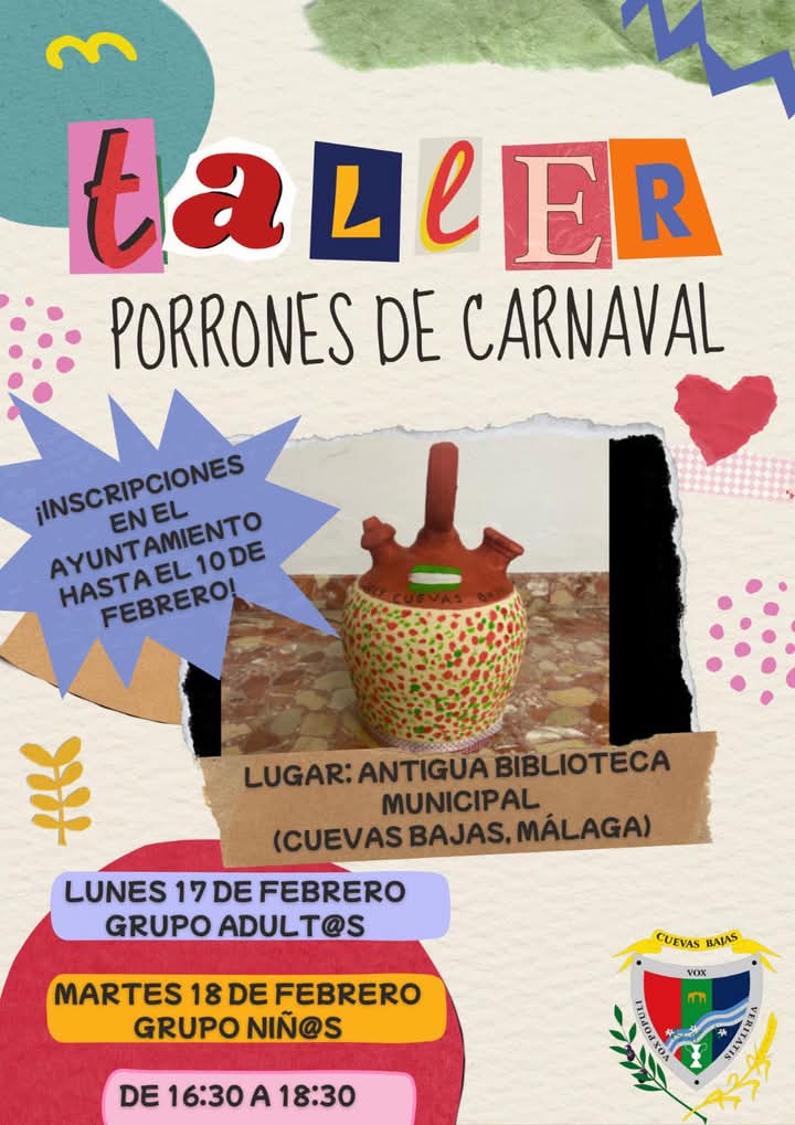 El Ayuntamiento de Cuevas Bajas organiza un taller especial de Porrones de Carnaval los días 17 y 18 de febrero en la antigua biblioteca municipal. La actividad, dirigida a adultos y niños, busca fomentar la creatividad y mantener viva una de las tradiciones más queridas del municipio