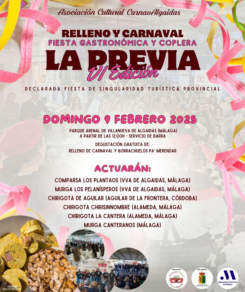 La Asociación Cultural CarnavAlgaidas en colaboración con el Ayuntamiento de Villanueva de Algaidas y la Diputación Provincial de Málaga, organiza la sexta edición de La Previa para dar comienzo a la cuenta atrás del Carnaval 2025. El evento ‘Relleno y Carnaval. Fiesta Gastronómica y Coplera. La Previa’, declarado Fiesta de Singularidad Turística Provincial, llega a la localidad como antesala para ir calentando motores.