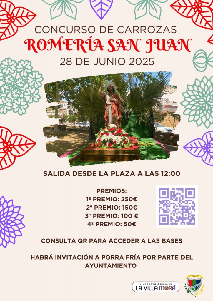 Cuevas Bajas ya calienta motores para la tradicional Romería San Juan, que este año se celebrará el 28 de junio con un colorido concurso de carrozas, premios en metálico y una refrescante invitación a porra fría por parte del Ayuntamiento