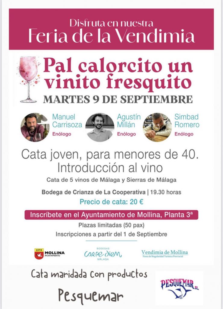 El precio de inscripción es de 20 euros e incluye la cata maridada con productos de Pesquemar, garantizando así una experiencia completa de sabores. Las inscripciones podrán realizarse a partir del 1 de septiembre en el Ayuntamiento de Mollina, planta 3ª, siendo el aforo limitado a 50 participantes.