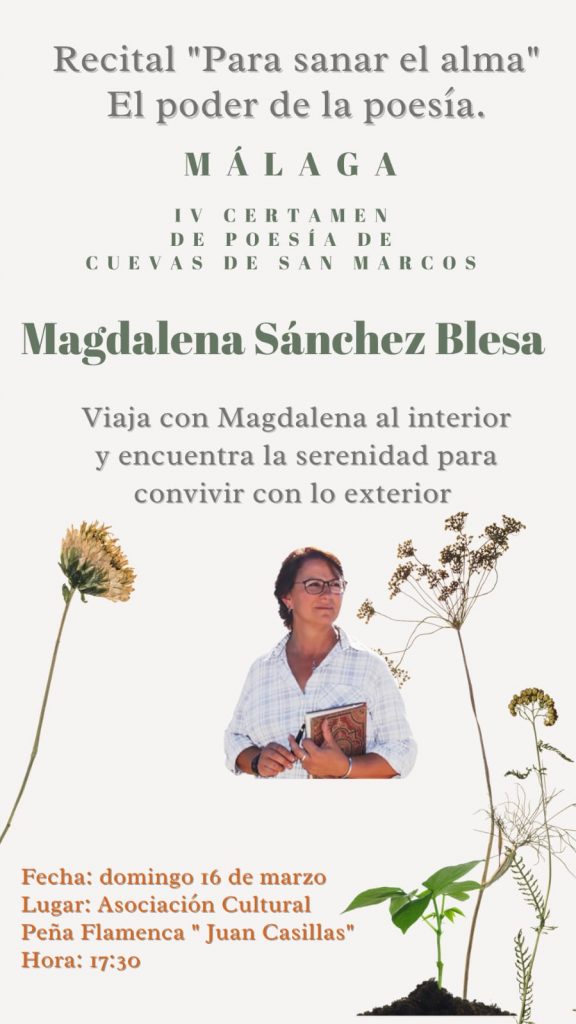 El IV Certamen de Poesía de Cuevas de San Marcos sigue sumando actividades culturales en el marco de la celebración del Día Mundial de la Poesía, que tendrá lugar el próximo 21 de marzo. Uno de los eventos más destacados será el recital de la reconocida poeta Magdalena Sánchez Blesa, quien ofrecerá su espectáculo «Para sanar el alma» el domingo 16 de marzo en la Asociación Cultural Peña Flamenca «Juan Casillas».